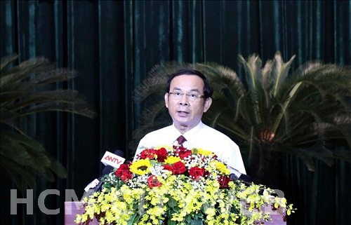 Ủy viên Bộ Chính trị, Bí thư Thành ủy TP Nguyễn Văn Nên phát biểu tại Hội nghị